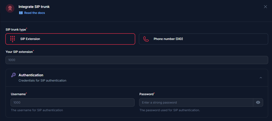 - Phone Number (DID) - Use this if you want to integrate a dedicated Direct Inward Dial (DID) number instead of a generic SIP extension.